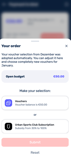 Go to the Benefit Sachbezug (non-cash benefit) section in the app and click on benefit selection when viewing your selection for the next month. You now have the option to choose between vouchers and Urban Sports Club membership. To activate your USC membership, follow the steps described above.