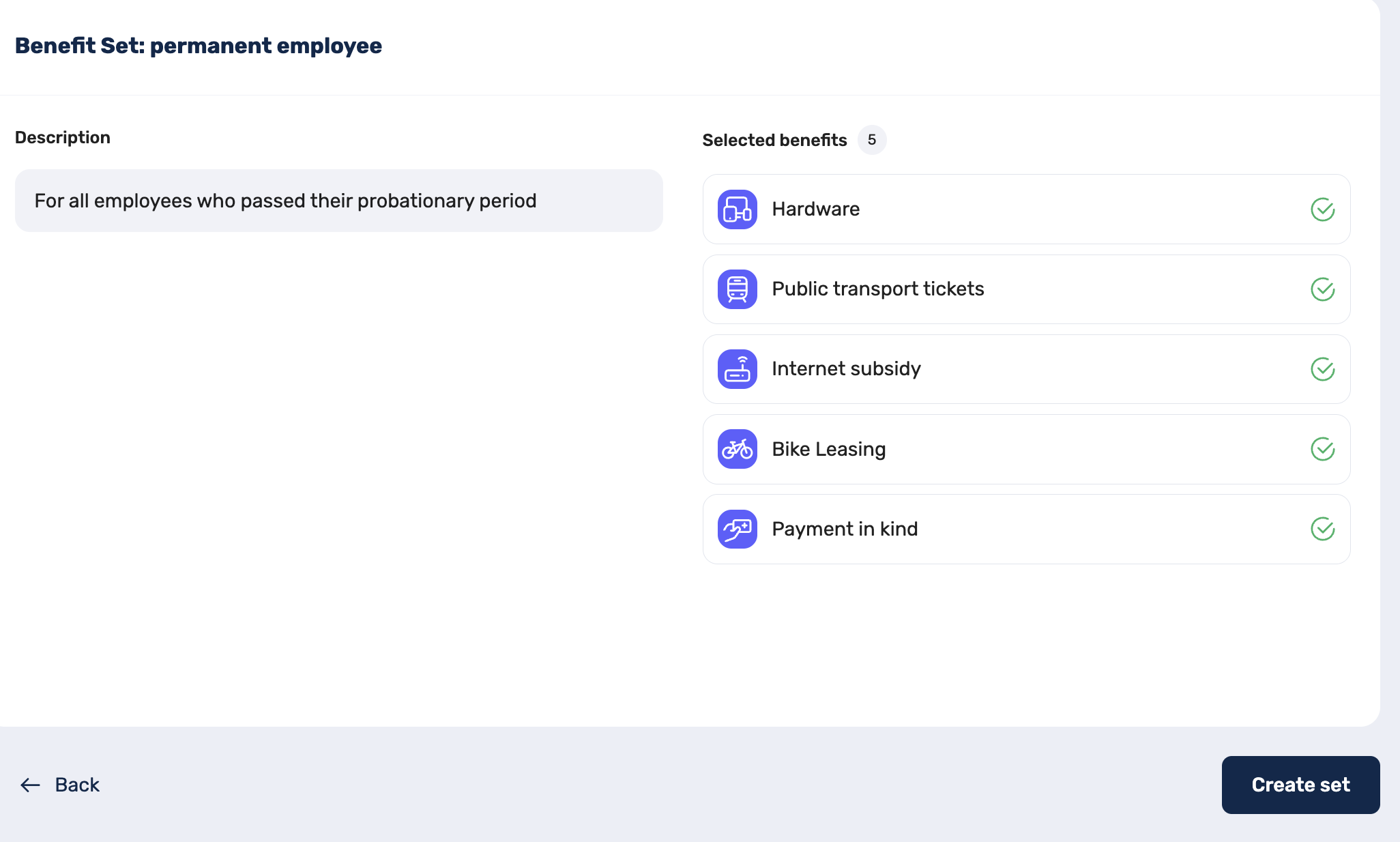 Finally, you will see an overview of your benefits package. You can save it or, if necessary, go back to make corrections to the name, description or selection of benefits: