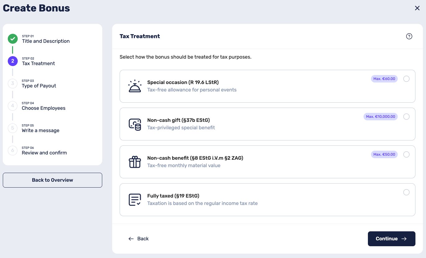 You decide which bonuses are included in the export. Tax treatments and payout types can be freely combined and individually activated or deactivated as needed.