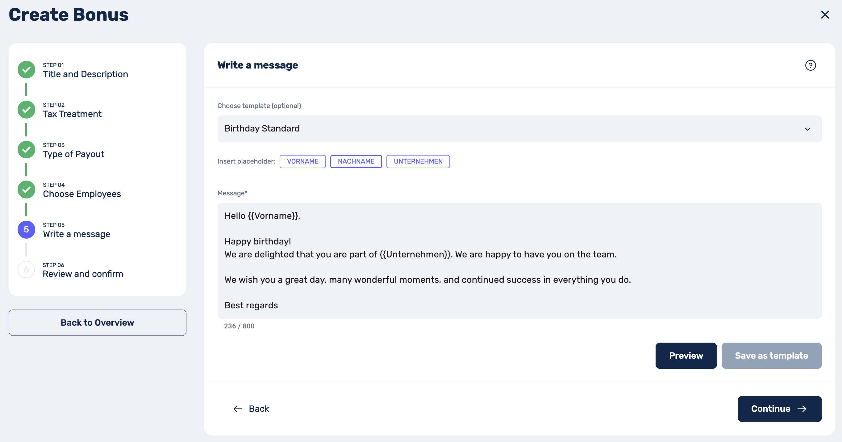 Once a one-time birthday bonus is active, no additional employees can be added (removal remains possible). The list should therefore be carefully checked before confirmation.