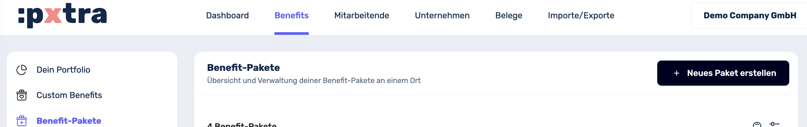 Zum Erstellen eines Benefit-Paketes gehe in der Plattform in den Reiter Benefits und anschließend auf Benefit-Pakete.