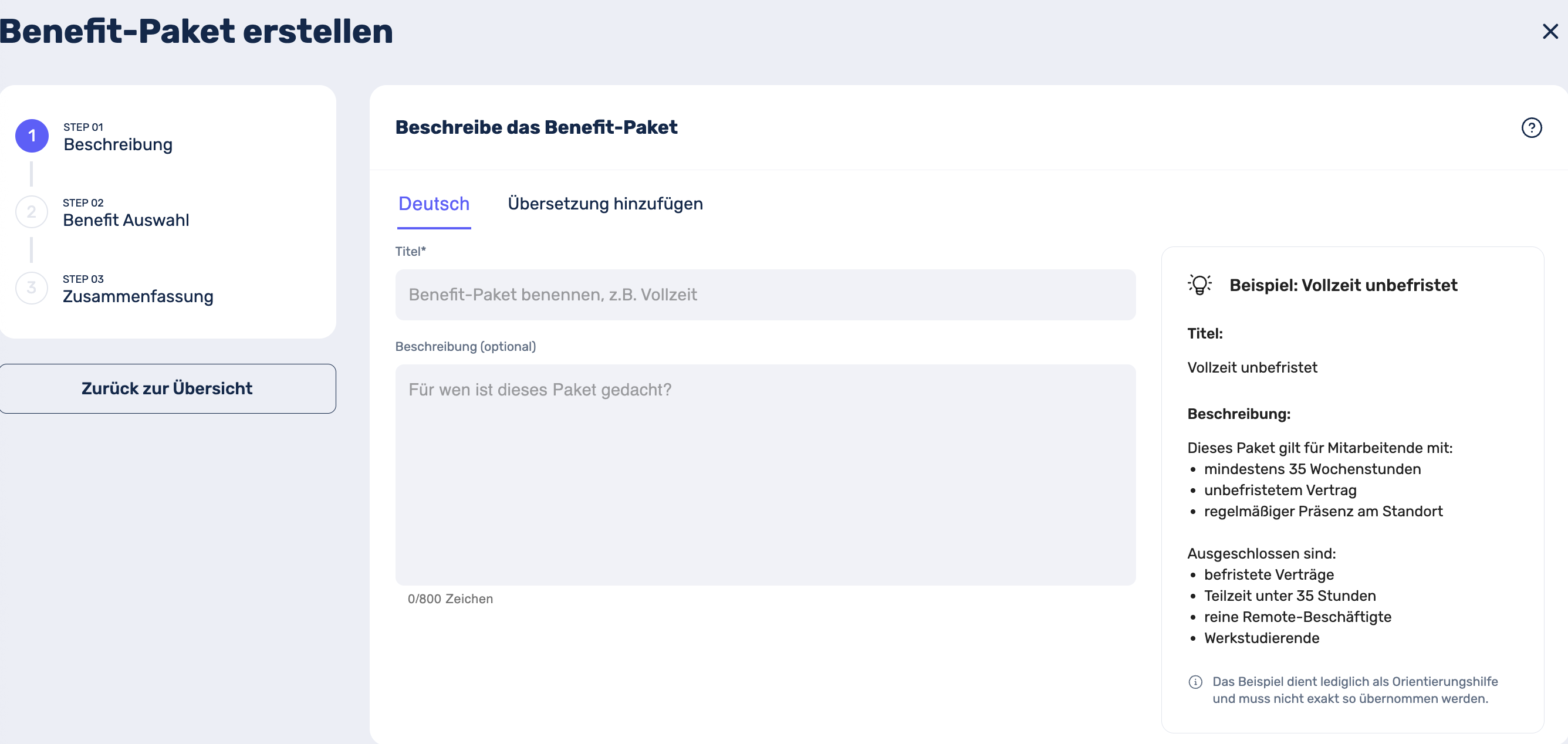 Vergib einen eindeutigen Namen für dein Benefit-Paket und trage, wenn du magst, auch eine Beschreibung zum Paket ein. Auf der rechten Seite findest du auch ein Beispiel, welches dir bei der Anlage hilft.