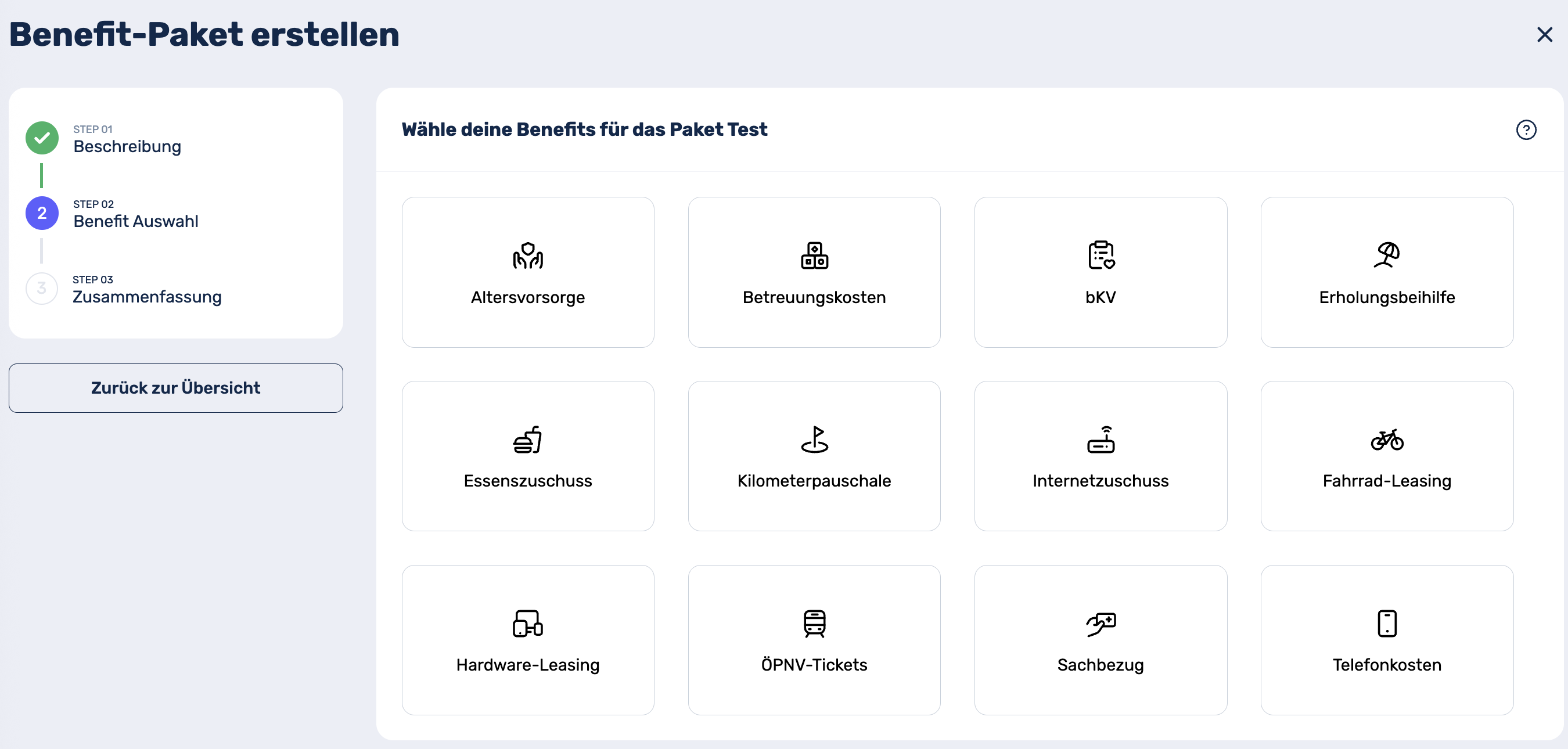 Im nächsten Schritt kannst du alle Benefits, die den Mitarbeitenden mit diesem Paket angezeigt werden sollen, auswählen: