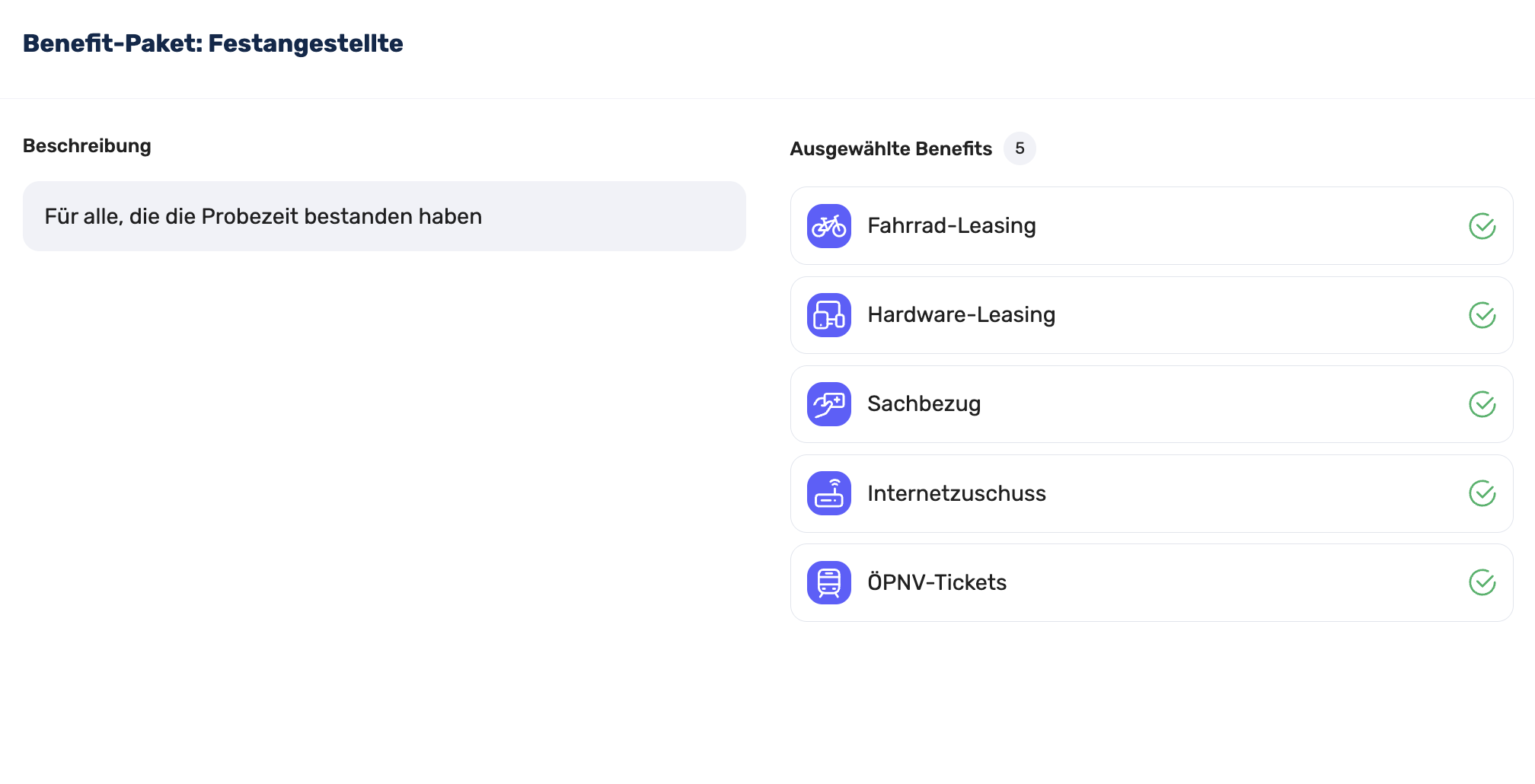 Wenn du unterschiedliche Benefits pro Mitarbeitenden Gruppe anbieten möchtest - bspw. Leasing-Angebote nur für Mitarbeitende, die bereits die Probezeit bestanden haben - sind die Benefit-Pakete genau das Richtige für dich.