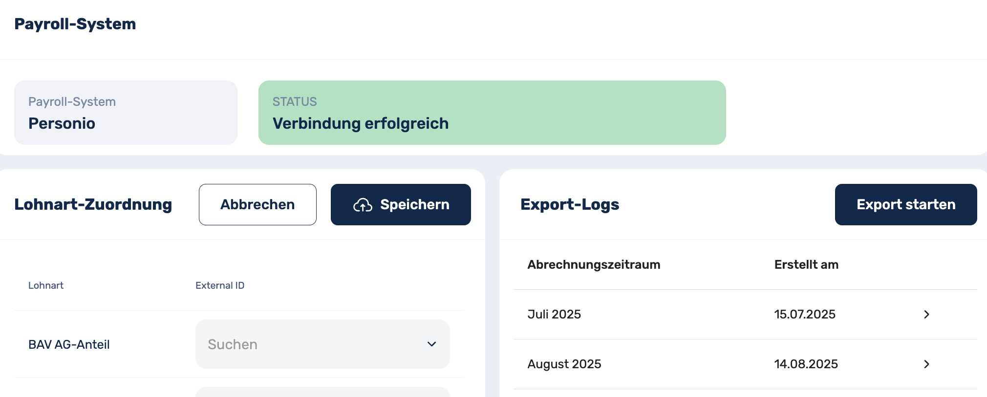 Wenn die Einrichtung abgeschlossen ist und der erste Payroll-Export benötigt wird, könnt ihr direkt in der Plattform im Bereich Benefits - Einstellungen - Payroll-Export den Export auf der rechten Seite starten und könnt anschließend in den Export Logs nachvollziehen, ob alles korrekt durchgelaufen ist oder ggf. Fehler aufgetreten sind:
